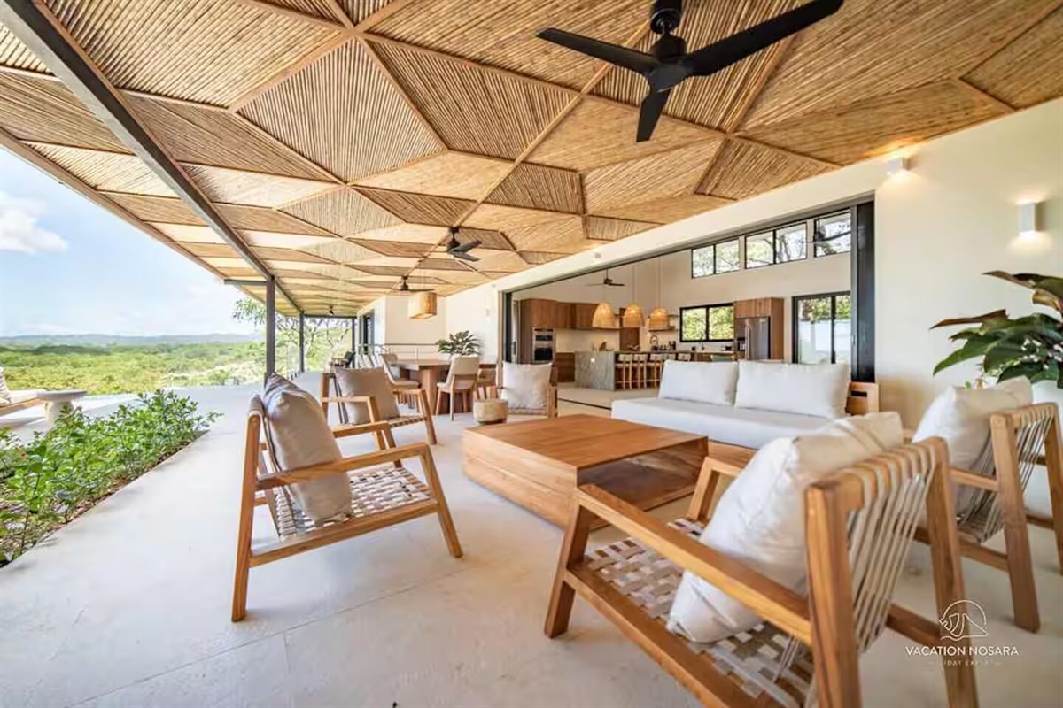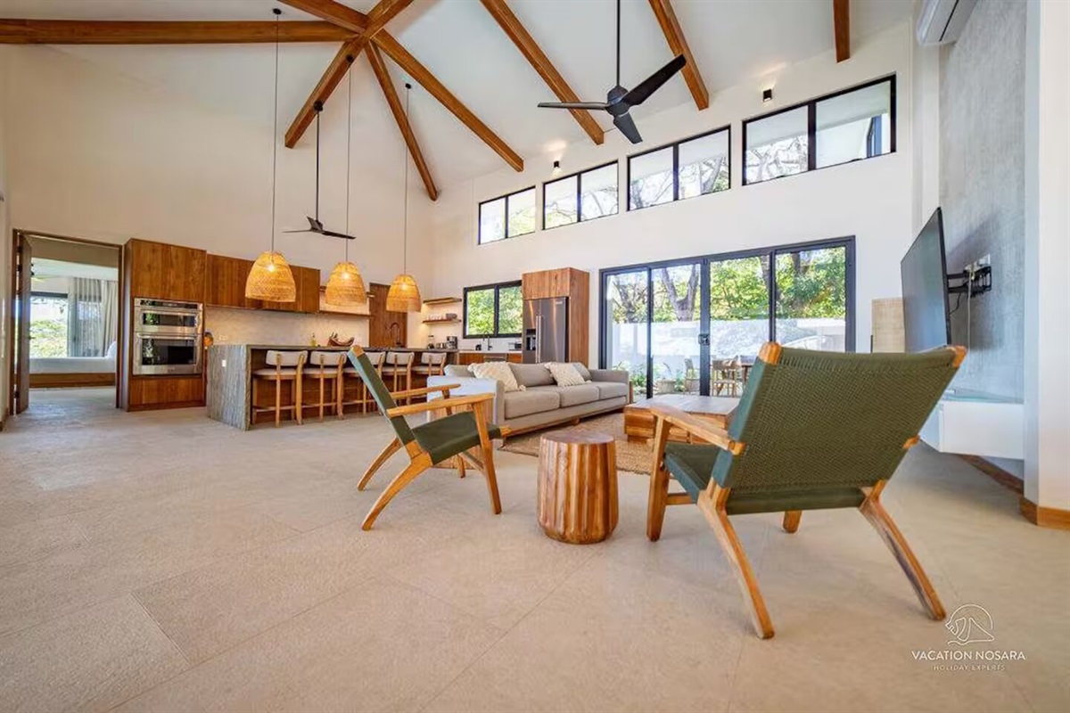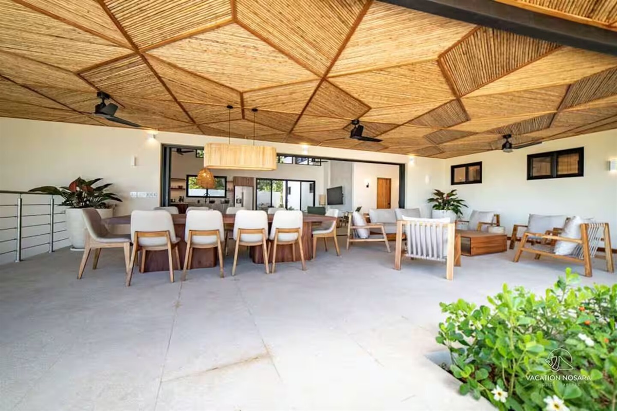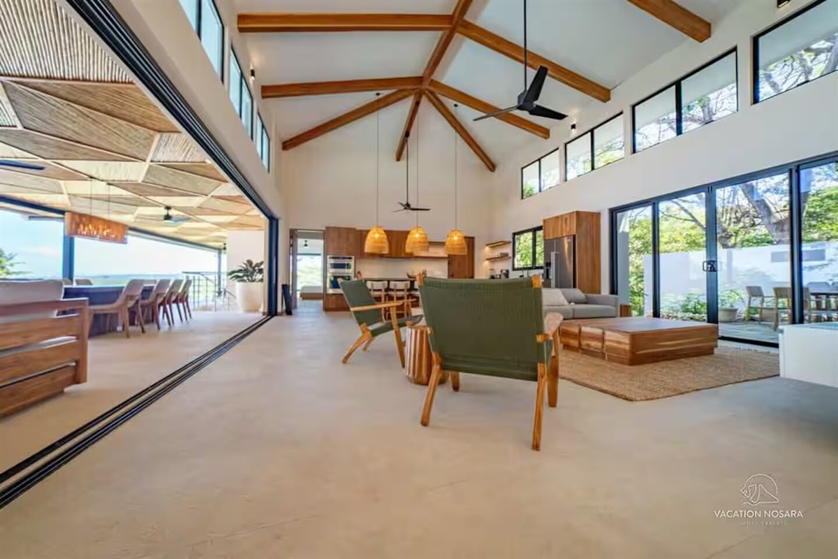As you step into Casa Salymar, you're greeted by a spacious living area that seamlessly blends indoor and outdoor living, offering breathtaking views of the ocean, the Boca Nosara river, and the surrounding nature preserve. The main kitchen, located in this central space, is fully equipped for all your culinary necessities. Adjacent to the kitchen, the expansive living room offers a perfect setting for relaxation and entertainment, with stunning ocean vistas as your backdrop.