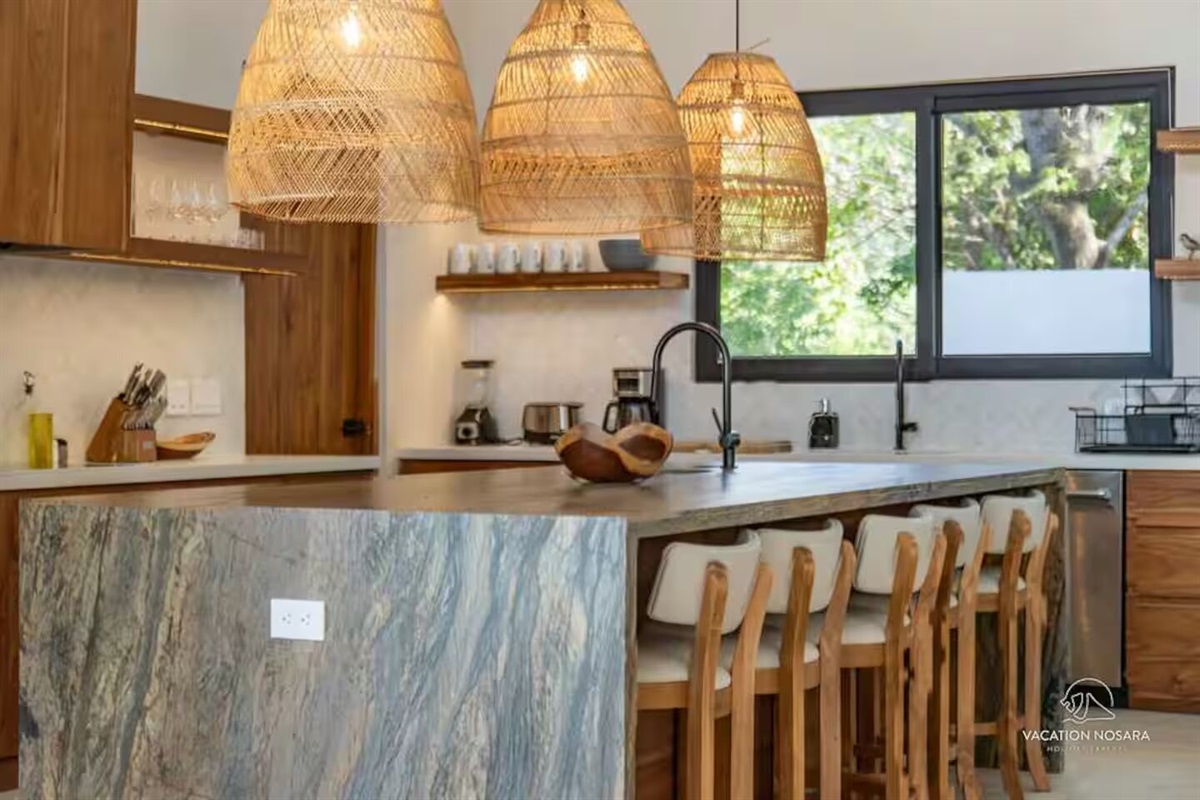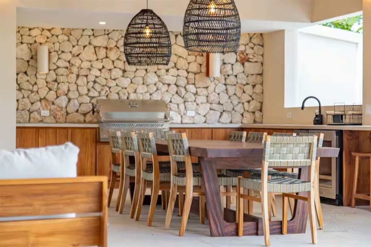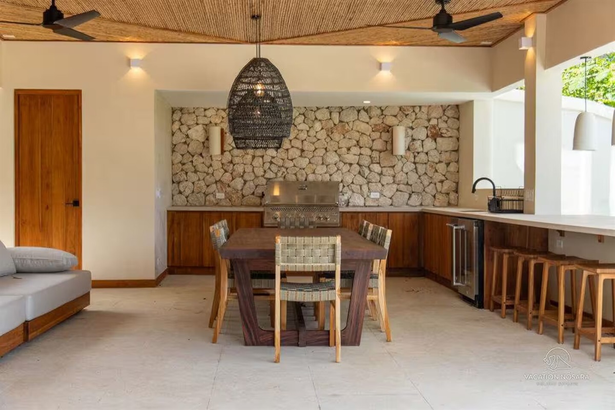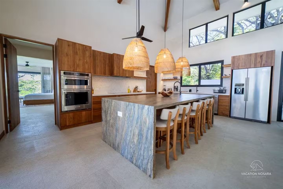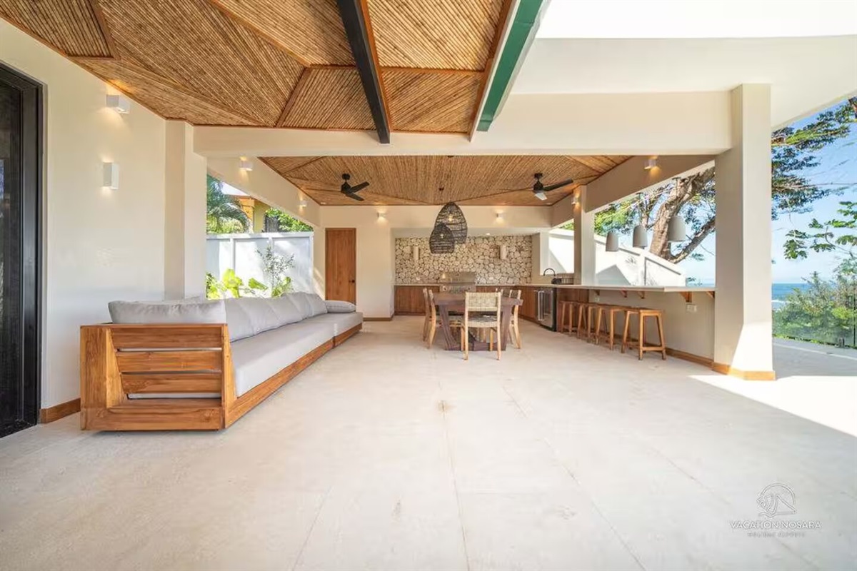 As you step into Casa Salymar, you're greeted by a spacious living area that seamlessly blends indoor and outdoor living, offering breathtaking views of the ocean, the Boca Nosara river, and the surrounding nature preserve. The main kitchen, located in this central space, is fully equipped for all your culinary necessities. Adjacent to the kitchen, the expansive living room offers a perfect setting for relaxation and entertainment, with stunning ocean vistas as your backdrop.