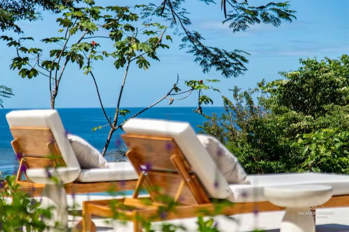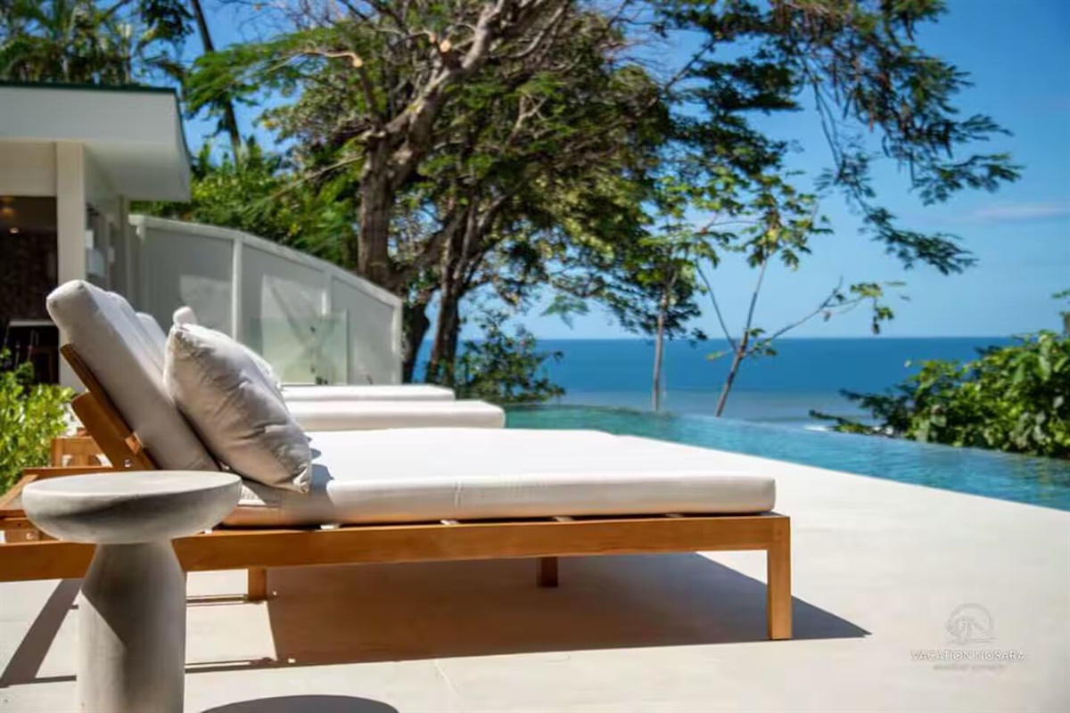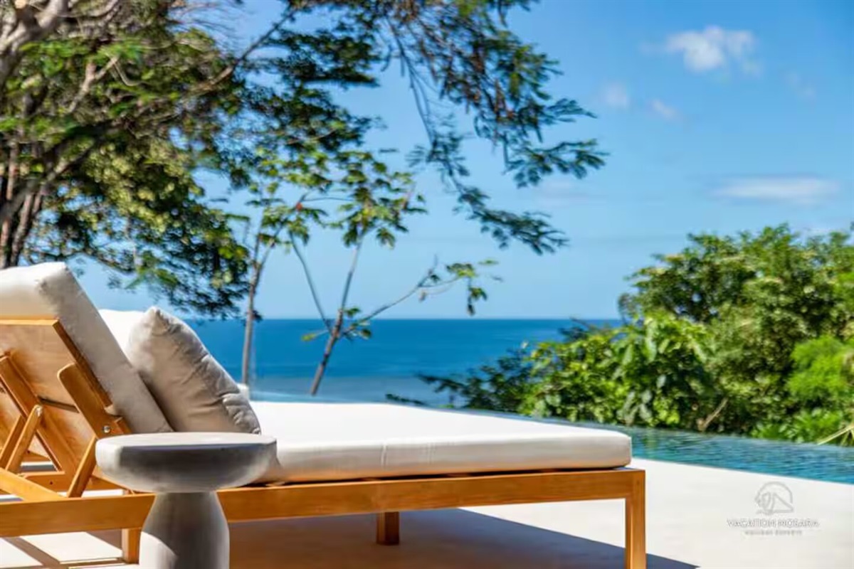 Here, guests can enjoy the tranquil view of the pool, which is visible from every bedroom in the main house. This large, infinity-edge pool offers a serene spot to soak up the sun, with the ocean stretching out before you.