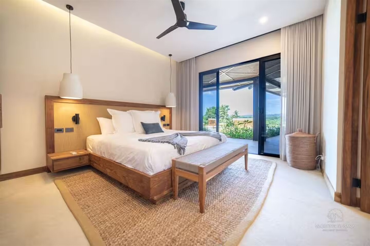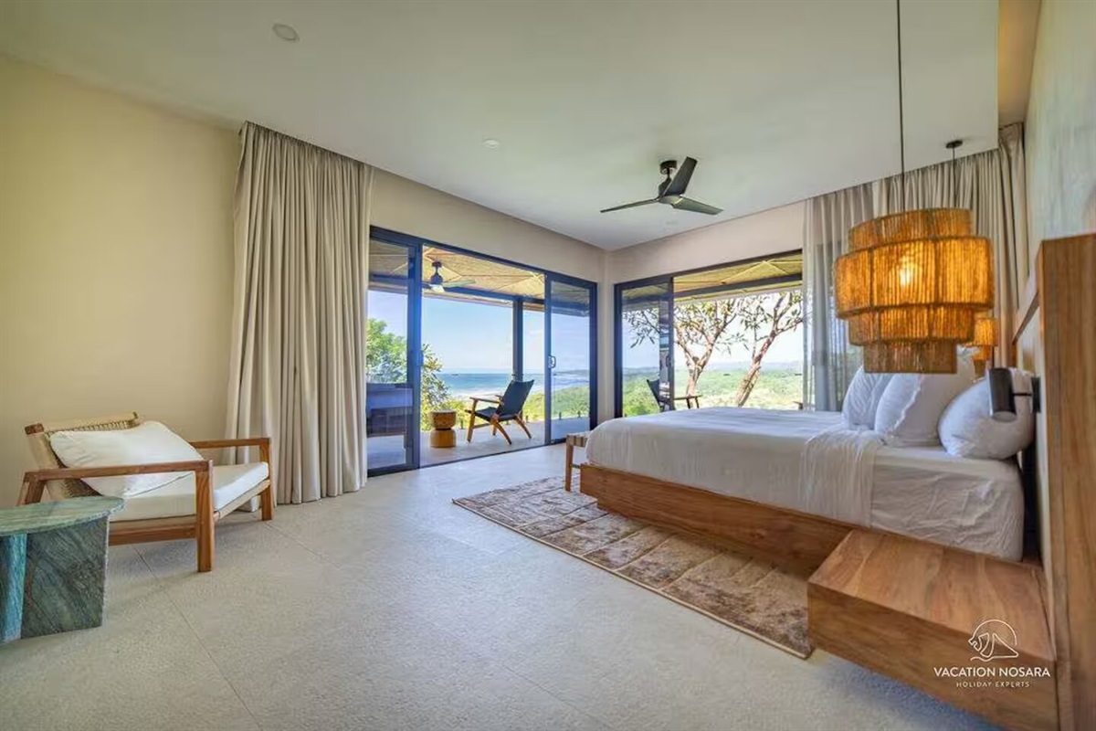 The master suite is a haven of serenity, boasting floor-to-ceiling windows that frame breathtaking ocean views. It includes a luxurious en-suite bathroom with both indoor and outdoor showers, offering a private oasis.