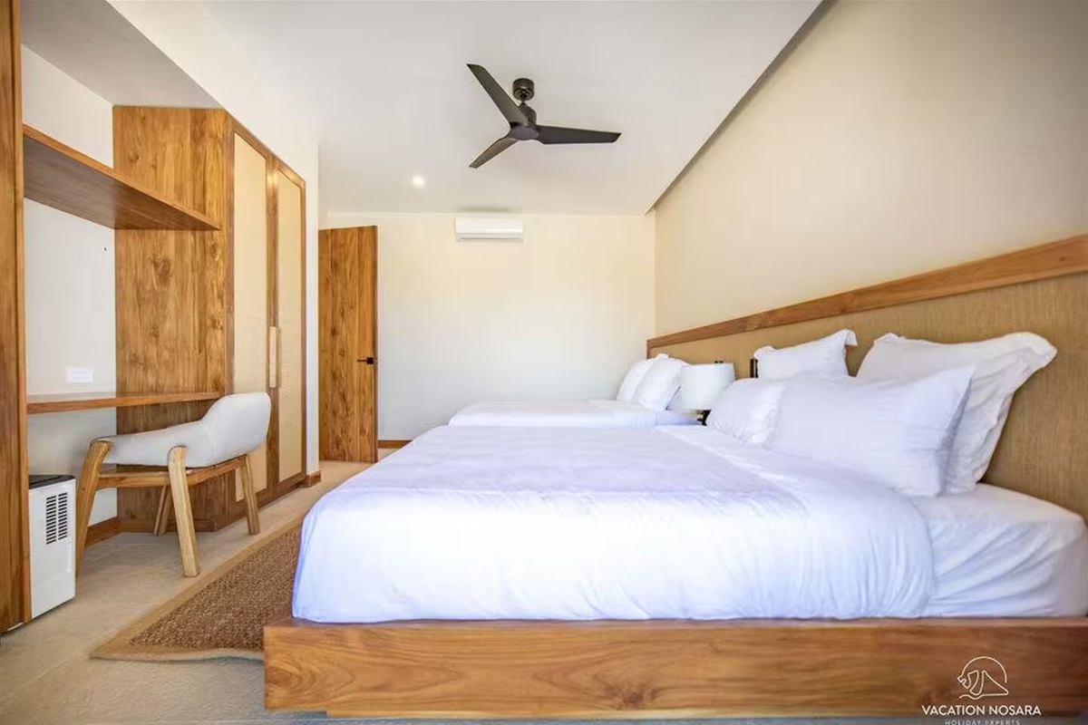 The second bedroom, also with a king bed, overlooks the inviting pool and offers a glimpse of the ocean, complete with its own en-suite bathroom. A third bedroom features two queen beds and is conveniently located next to another spacious full bathroom. An additional private apartment/mini suite is nestled beneath the main house, providing a secluded retreat for two with all the same amenities.